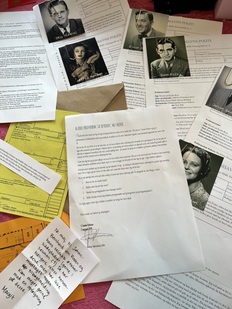 Jeg lagde ud med at læse op af præsentationen til mordmysteriet. Her var der tale om en meget dygtig og berømt skuespiller, der midt under en forestilling var blevet myrdet. Vi blev så bedt om at finde ud af: