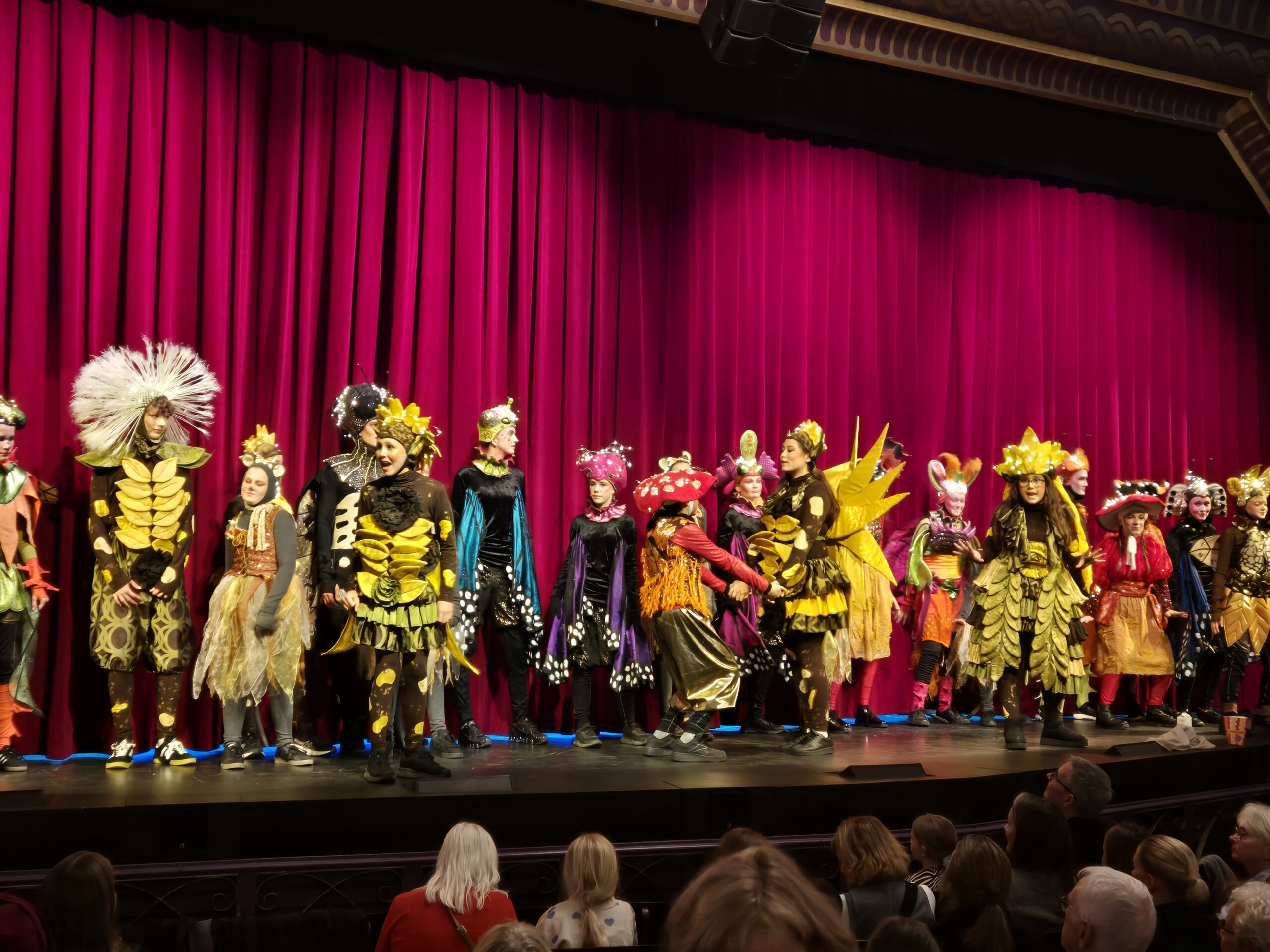 Vi har fundet vores pladser, og når vi kigger rundt fornemmer vi klart denne forventningsfulde mumlen – mon det bliver lige så godt som tidligere? Vil vi kunne fornemme magien og den særlige Eventyrteater vibe? – og vil de unge skuespillere på scenen virkelig turde at komme helt frem til scenekanten, så vi publikum kan mærke dem? Vi glæder os i hvert fald. Lyset dæmpes og den imponerende lysekrone hæves og forestillingen starter.